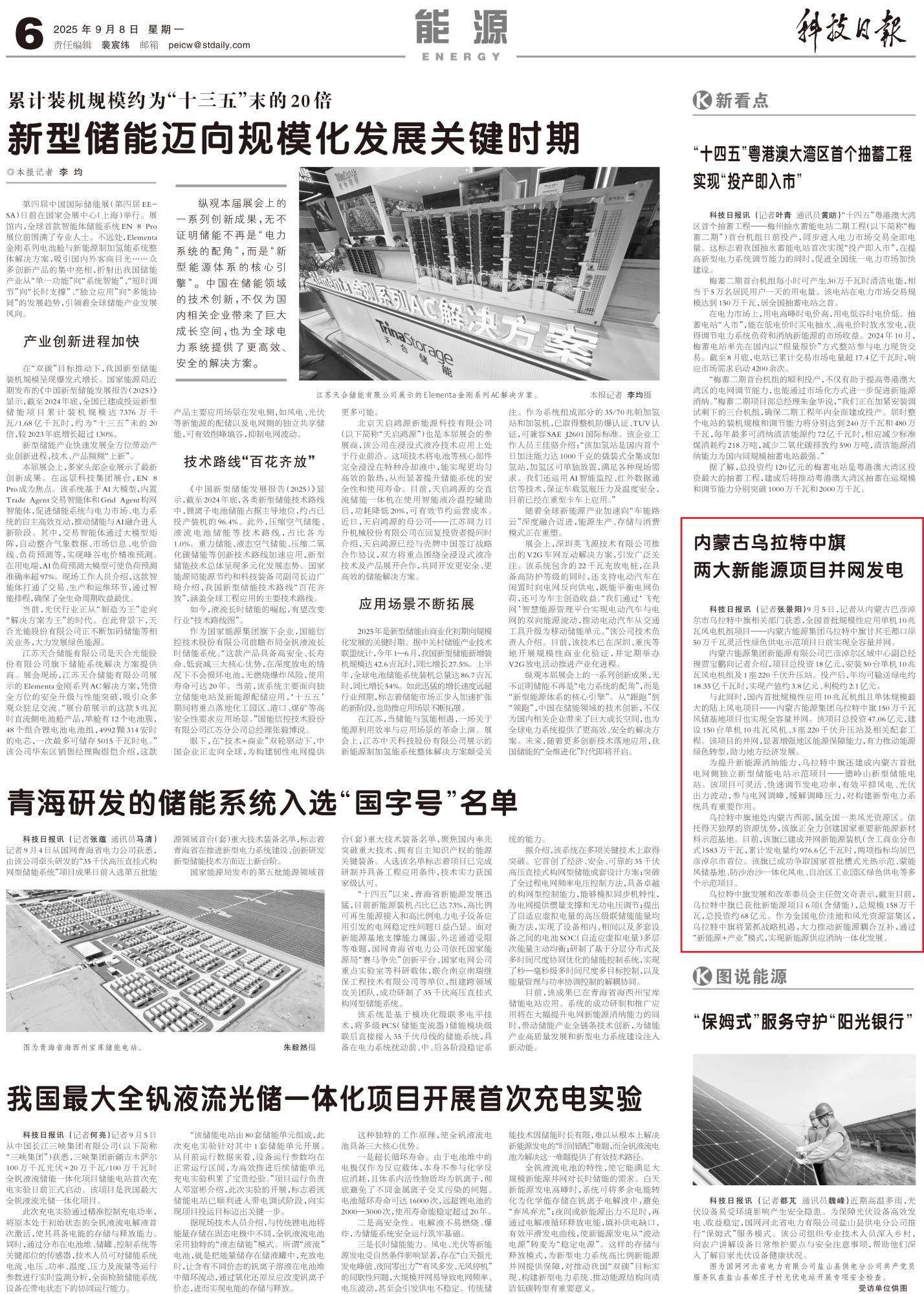 2025年9月8日,《科技日報》第6版整版刊發(fā)題為《內(nèi)蒙古烏拉特中旗兩大新能源項目并網(wǎng)發(fā)電》的文章,報道了記者從內(nèi)蒙古巴彥淖爾市烏拉特中旗相關(guān)部門獲悉,全國首批規(guī)模性應(yīng)用單機10兆瓦風電機組項目——內(nèi)蒙古能源集團烏拉特中旗甘其毛都口岸50萬千瓦靈活性綠色供電示范項目日前實現(xiàn)全容量并網(wǎng)。