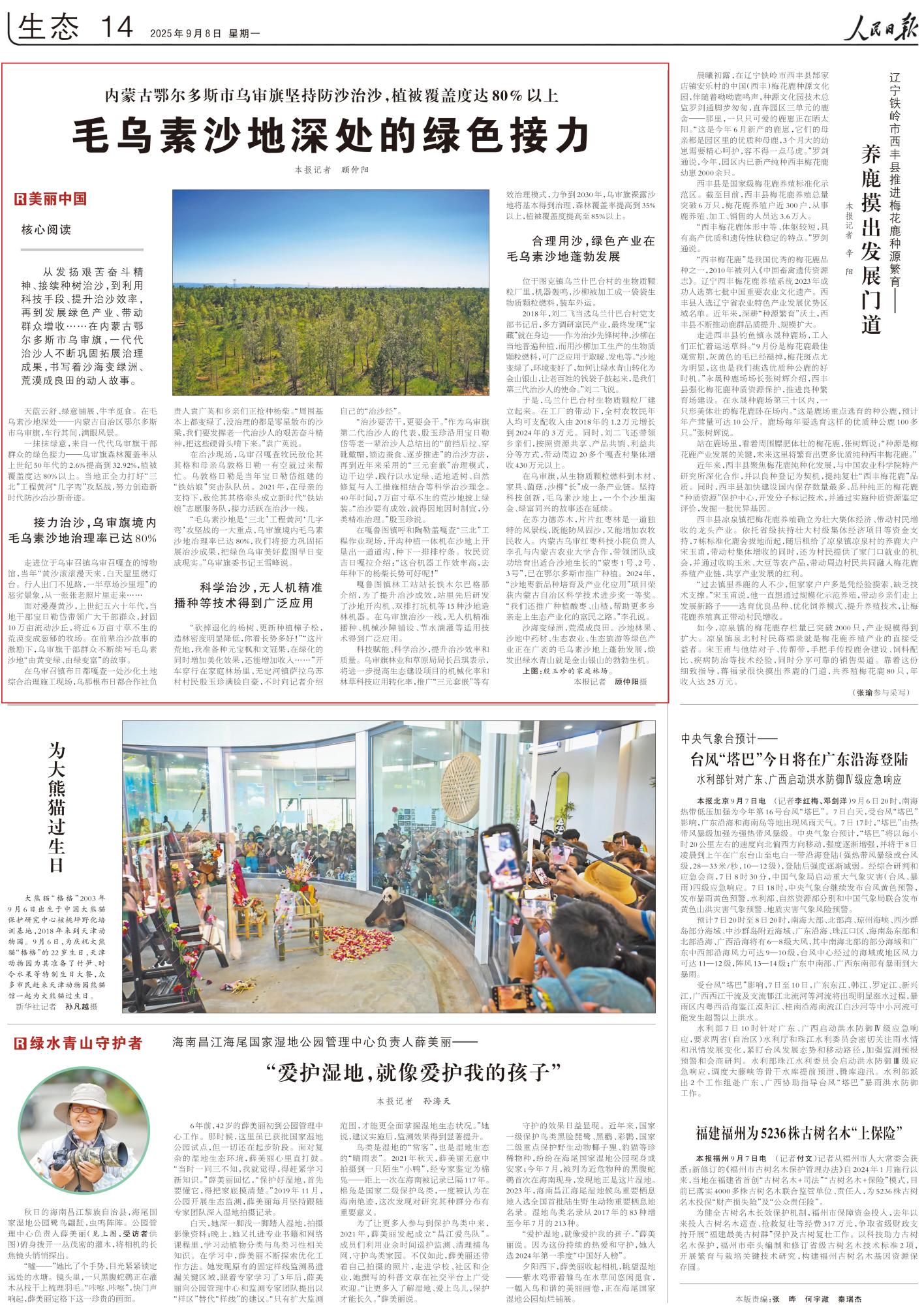 2025年9月8日《人民日報》第14版刊發(fā)了《內(nèi)蒙古鄂爾多斯市烏審旗堅持防沙治沙,植被覆蓋度達80%以上 毛烏素沙地深處的綠色接力》的文章,報道了在內(nèi)蒙古鄂爾多斯市烏審旗,一代代治沙人不斷鞏固拓展治理成果,書寫著沙海變綠洲、荒漠成良田的動人故事。沙地林果、沙地中藥材、生態(tài)農(nóng)業(yè)、生態(tài)旅游等綠色產(chǎn)業(yè)正在廣袤的毛烏素沙地上蓬勃發(fā)展,煥發(fā)出綠水青山就是金山銀山的勃勃生機。