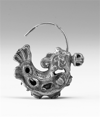 在遼代的文物遺存中,摩羯圖像廣泛見諸于各類器物上,從隨身佩戴的飾件到案頭陳設的器皿,從服飾上的精美紋樣到與宗教相關(guān)的器物,有摩羯形金耳墜、摩羯紋銀盤、摩羯紋銅鏡、摩羯紋鎏金繁花銀盞托、摩羯形白瓷燈、摩羯形注壺、摩羯紋緙絲草帽等。這些遍布于遼代各類器物上的摩羯形象,并非本土原生的文化符號,其背后承載著跨越地域的各民族交往交流交融和文化融通互鑒的歷程。
