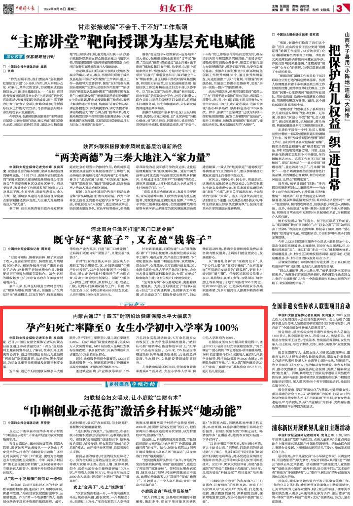 2025年11月18日《中國(guó)婦女報(bào)》第3版刊發(fā)了《內(nèi)蒙古通遼“十四五”時(shí)期婦幼健康保障水平大幅躍升 孕產(chǎn)婦死亡率降至0 女生小學(xué)初中入學(xué)率為100%》的文章,報(bào)道了近年來(lái),通遼市婦幼健康保障水平大幅躍升,孕產(chǎn)婦死亡率降至0,嬰兒死亡率降至2.28‰。婦女“兩癌”篩查成效顯著,完成50萬(wàn)人次免費(fèi)篩查,1461名低收入患病婦女獲得全額救助。聯(lián)合醫(yī)療部門開展的講座和義診惠及10萬(wàn)余名婦女群眾。