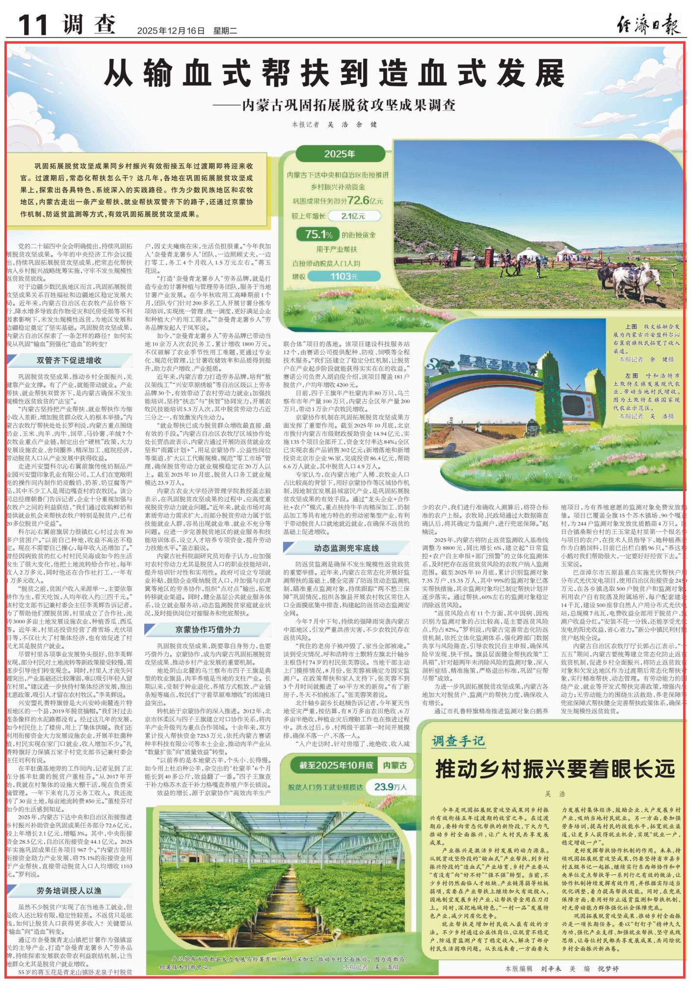 2025年12月16日,《經(jīng)濟(jì)日報(bào)》第11版刊發(fā)題為《從輸血式幫扶到造血式發(fā)展——內(nèi)蒙古鞏固拓展脫貧攻堅(jiān)成果調(diào)查》的文章,報(bào)道了鞏固拓展脫貧攻堅(jiān)成果同鄉(xiāng)村振興有效銜接五年過渡期即將迎來收官。作為少數(shù)民族地區(qū)和農(nóng)牧地區(qū),內(nèi)蒙古走出一條產(chǎn)業(yè)幫扶、就業(yè)幫扶雙管齊下的路子,還通過京蒙協(xié)作機(jī)制、防返貧監(jiān)測等方式,有效鞏固拓展脫貧攻堅(jiān)成果。