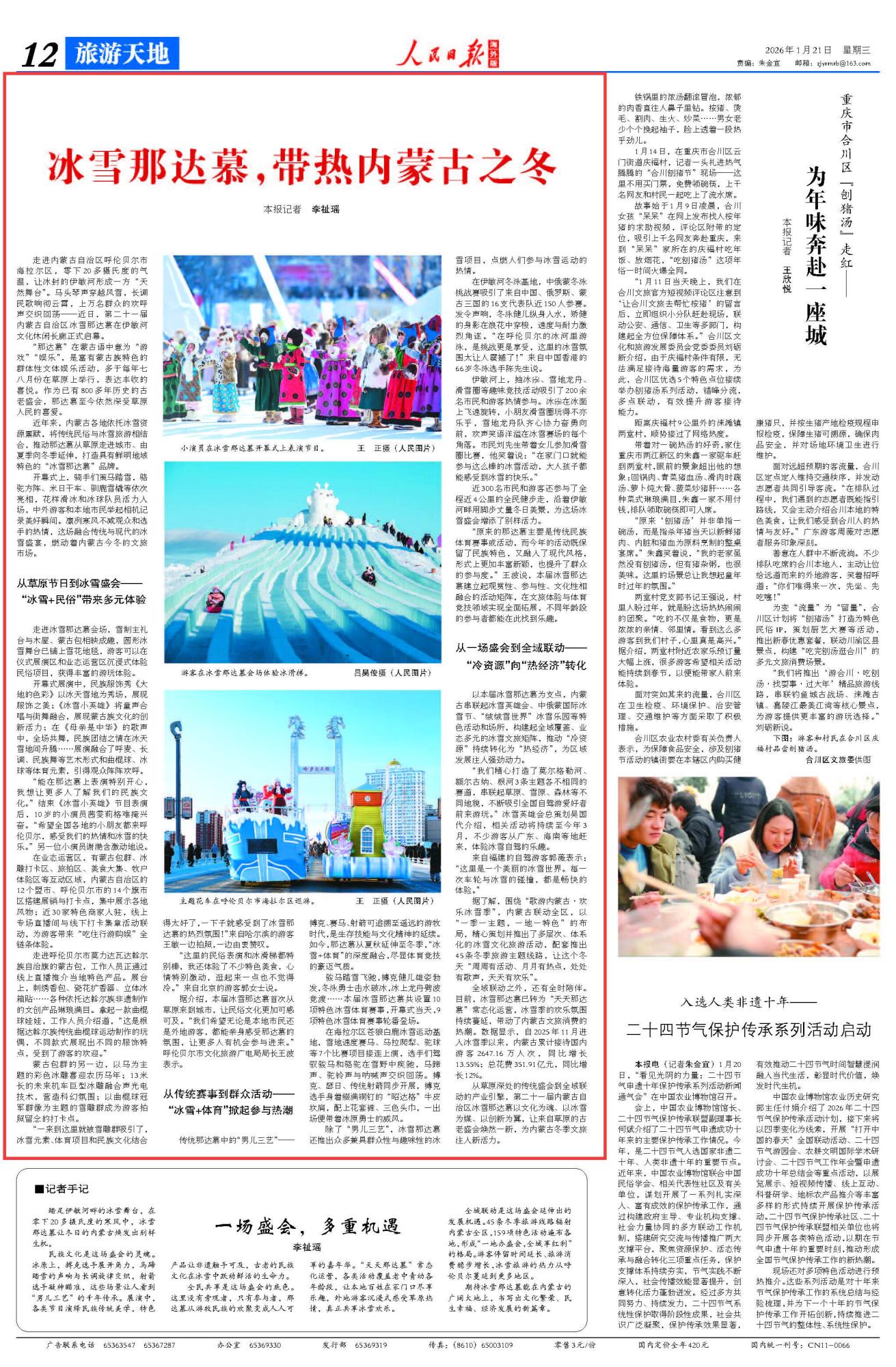 2026年1月21日《人民日報海外版》第12版刊發(fā)了《冰雪那達慕,帶熱內蒙古之冬》的文章,報道了近年來,內蒙古各地依托冰雪資源稟賦,將傳統(tǒng)民俗與冰雪旅游相結合,推動那達慕從草原走進城市、由夏季向冬季延伸,打造具有鮮明地域特色的“冰雪那達慕”品牌,為內蒙古冬季文旅注入新活力。