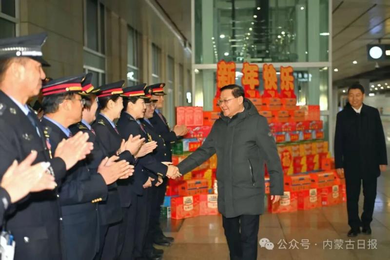 2月13日,自治區(qū)黨委書記、人大常委會(huì)主任王偉中在呼和浩特火車東站調(diào)研春運(yùn)期間人流車流、安全保障等情況,看望慰問工作人員。草原云·內(nèi)蒙古新聞網(wǎng)記者 馬建兵 攝