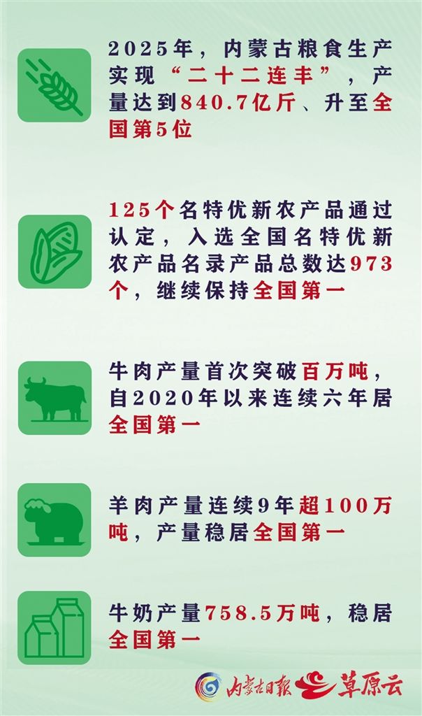 從河套平原的繁忙備耕到錫林郭勒草原的牛羊成群,再到敕勒川的奶香四溢,內(nèi)蒙古以“糧倉”更實(shí)、“肉庫”更足、“奶罐”更豐的堅(jiān)實(shí)底氣,扛起建設(shè)國(guó)家重要農(nóng)畜產(chǎn)品生產(chǎn)基地的使命擔(dān)當(dāng)。