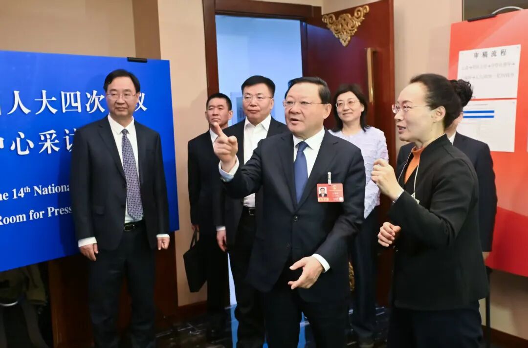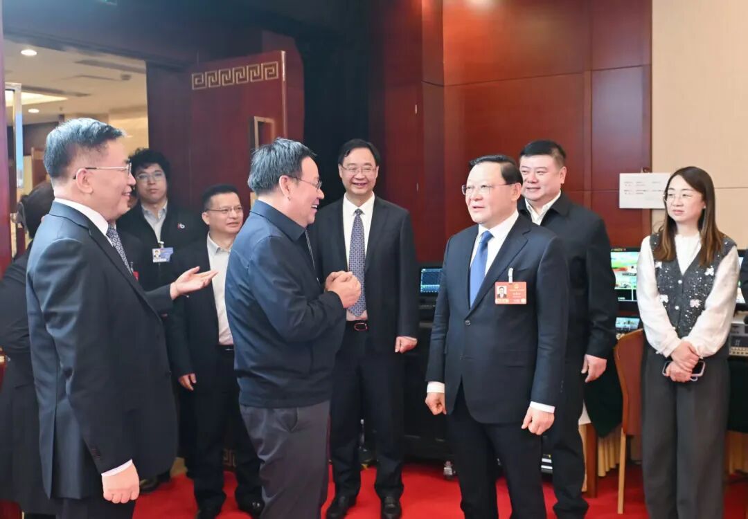 3月6日,自治區(qū)黨委書(shū)記、人大常委會(huì)主任王偉中,自治區(qū)黨委副書(shū)記、自治區(qū)人民政府主席包鋼在內(nèi)蒙古日?qǐng)?bào)社兩會(huì)報(bào)道工作間與記者代表親切交流,詳細(xì)了解宣傳報(bào)道情況。草原云·內(nèi)蒙古新聞網(wǎng)記者 馬建兵 攝