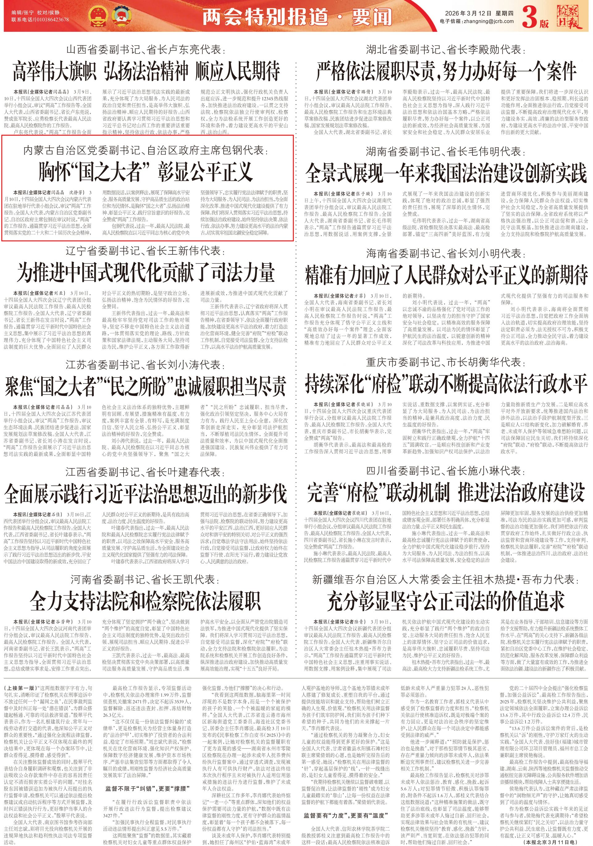 2026年3月11日《檢察日報》第3版刊發(fā)了《內蒙古自治區(qū)黨委副書記、自治區(qū)政府主席包鋼代表: 胸懷“國之大者” 彰顯公平正義 》的文章,報道了十四屆全國人大四次會議內蒙古代表團在駐地舉行代表小組會議,審議“兩高”工作報告。全國人大代表,內蒙古自治區(qū)黨委副書記、自治區(qū)政府主席包鋼在審議時說,“兩高”的工作報告,通篇貫穿習近平法治思想,全面貫徹落實黨的二十大和二十屆歷次全會精神,用數(shù)據說話,以案例釋法,展現(xiàn)了保障高水平安全、服務高質量發(fā)展、守護高品質生活的政治站位和為民情懷,是胸懷“國之大者”、弘揚法治精神、彰顯公平正義、踐行宗旨意識的好報告,完全贊成“兩高”工作報告。