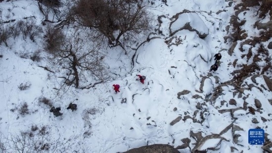 2月20日,在內(nèi)蒙古賀蘭山國(guó)家級(jí)自然保護(hù)區(qū),工作人員在山間跋涉(無(wú)人機(jī)照片)。