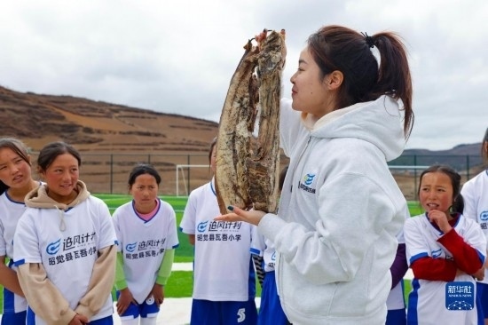 圖為四川籍的中國(guó)女足國(guó)腳萬(wàn)佳瑤(前)獲贈(zèng)瓦吾小學(xué)女足球隊(duì)員從家里帶來(lái)的臘肉(2023年3月3日攝)。