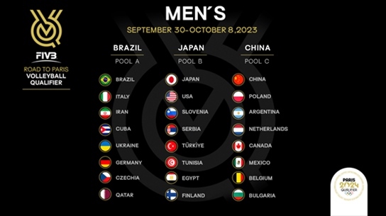 男排資格賽將于2023年9月30日至10月8日分別在中國、日本和巴西舉行,分組抽簽規(guī)則與女排相同。經過抽簽,A組球隊分別是巴西、意大利、伊朗、古巴、烏克蘭、德國、捷克、卡塔爾;B組為日本、美國、斯洛文尼亞、塞爾維亞、土耳其、突尼斯、埃及、芬蘭;中國與波蘭、阿根廷、荷蘭、加拿大、墨西哥、比利時和保加利亞分在C組。