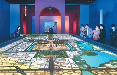 走進“壯美中軸”展區(qū),一個16米長的沙盤將北京中軸線沿線建筑全貌清晰呈現(xiàn)在眼前,帶給人強烈的視覺震撼。北起鐘鼓樓,南至永定門,北京中軸線全長約7.8公里,是世界上現(xiàn)存最長的城市中軸線。沙盤上的立體投影模擬出晝夜交替、四季輪轉(zhuǎn)的景象,讓人仿佛穿越時空,感受中軸線的歷史演變。沙盤兩側(cè)的電子屏滾動播放著三維動畫,立體展現(xiàn)故宮、天壇、景山等中軸線重要遺產(chǎn)點。