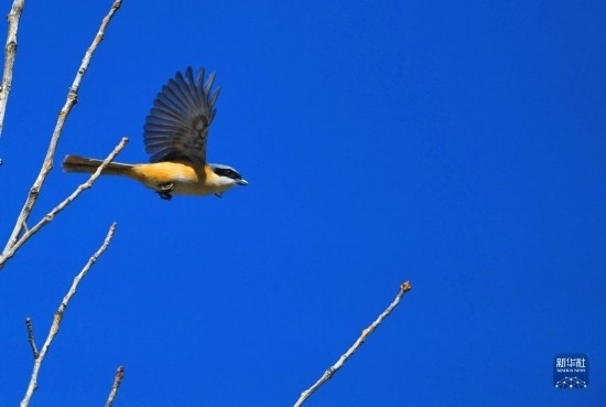 灰背伯勞在拉薩市城關(guān)區(qū)蔡公堂街道次角林村上空飛過(guò)(5月14日攝)。