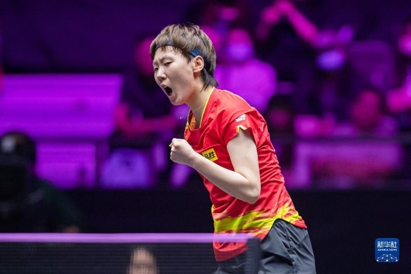 2023年4月15日,孫穎莎慶祝比賽獲勝。當(dāng)日,在河南新鄉(xiāng)舉行的世界乒乓球職業(yè)大聯(lián)盟(WTT)新鄉(xiāng)冠軍賽女單決賽中,中國選手孫穎莎以4比1戰(zhàn)勝隊友王藝迪,奪得冠軍。新華社記者 李嘉南攝