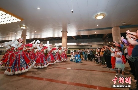 5月28日,北京援藏重點(diǎn)支持項(xiàng)目——2023年首趟“心連心·京藏號(hào)”旅游列車(chē)載著400多名游客從北京西站發(fā)車(chē)。該旅游列車(chē)全程共計(jì)14天,將途經(jīng)西寧、拉薩、林芝、山南等地。圖為舞蹈演員在站臺(tái)上跳起藏族舞蹈為游客送行。