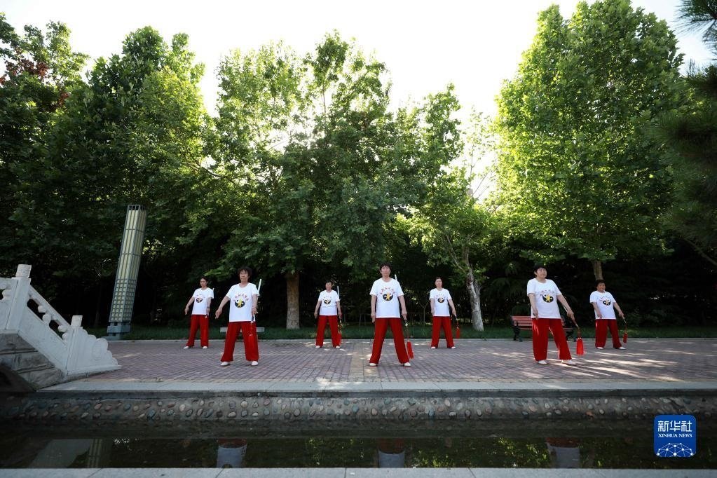 6月9日,太極拳愛好者在河北省邢臺市任澤區(qū)人民廣場展示王其和太極拳器械太極劍。