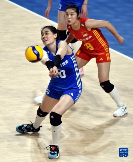 6月16日,中國隊球員王云蕗(前)在比賽中墊球。新華社記者 盧炳輝 攝
