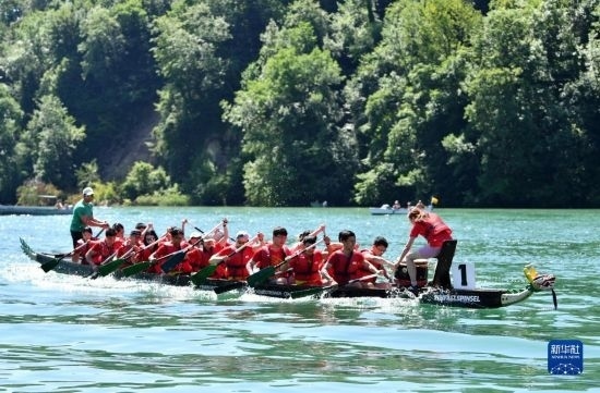 6月25日,在瑞士埃格利紹,瑞士蘇黎世州華僑華人組織的“龍戰(zhàn)隊(duì)”參加賽龍舟活動。