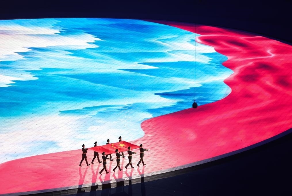 地屏上,一幅紅綢飛掠壯麗河山。8名儀仗兵步伐鏗鏘,護(hù)旗入場(chǎng)。“我愛(ài)你中國(guó),我愛(ài)你春天蓬勃的秧苗……”動(dòng)人的贊歌深情唱響。