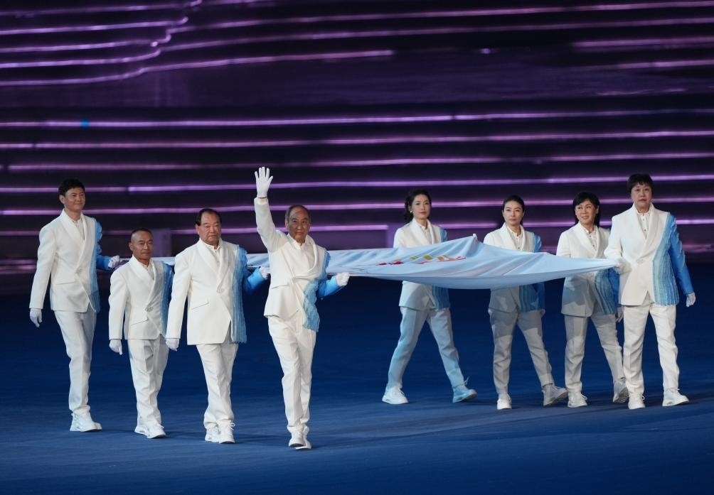 9月23日,亞奧理事會(huì)會(huì)旗在開(kāi)幕式上入場(chǎng)。新華社記者 杜宇 攝