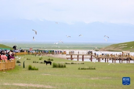 游客在巴音布魯克天鵝湖景區(qū)參觀(7月6日攝)。