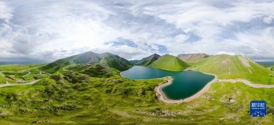 這是和靜縣一處高山湖泊景觀(7月5日攝,無人機(jī)全景照片)。