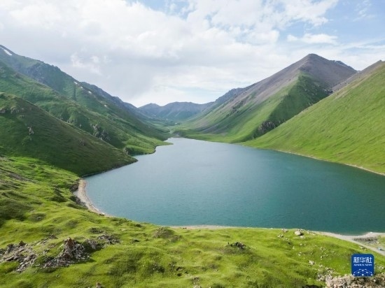這是和靜縣一處高山湖泊景觀(7月5日攝,無人機(jī)照片)。