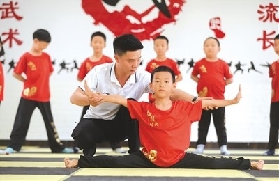 暑假期間,貴州省貴陽市開陽縣青少年學生校外活動中心免費開辦少兒武術班,吸引當?shù)貝酆梦湫g的孩子參加學習。圖為7月18日,在少兒武術班,孩子們在老師的指導下練習武術動作。袁福洪攝(人民圖片)