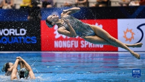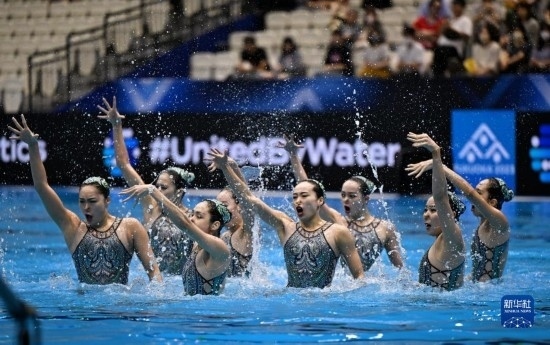 7月21日,中國(guó)隊(duì)在比賽中。當(dāng)日,在日本福岡舉行2023年世界游泳錦標(biāo)賽花樣游泳集體自由自選決賽中,中國(guó)隊(duì)以329.1687分的成績(jī)獲得冠軍。新華社記者 夏一方 攝