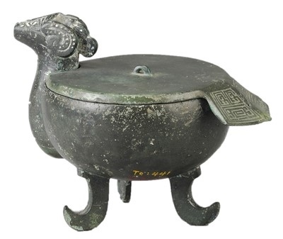 三足羊首銅尊由蓋和器身兩部分組成。蓋呈圓形扁平狀,正中間置一橋型小鈕,邊緣一段半圓弧形豁口卡住羊頸部,另一端向外延伸,略呈扇形并下斜,象征羊尾。腹身一側(cè)外凸成羊頸狀,口沿上部鑄成羊首,頸與尊腹相連。此尊造型生動(dòng)、獨(dú)特,在同類器物中實(shí)屬罕見(jiàn),是安徽楚文化博物館7件“鎮(zhèn)館之寶”之一。