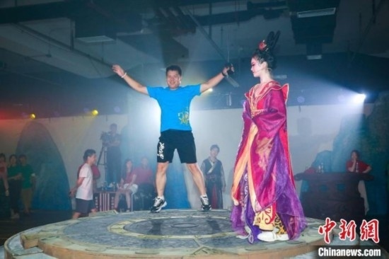 《猴王問世》導(dǎo)演郝博介紹,這部戲提煉《山海經(jīng)》背景而創(chuàng)作,以金、水、木、火、土五行相生的順序,對應(yīng)白、藍、綠、紅、黃五個顏色,以及悲、恐、怒、喜、思五種情緒,與此相應(yīng)還有“后羿射日”“大禹治水”“刑天斷首”“夸父逐日”“女媧補天”五段神話故事。“當(dāng)下年輕人的生活節(jié)奏快、壓力大,我們希望觀眾成為‘玩家’,通過‘參演’音樂劇《猴王問世》,釋放壓力,丟掉情緒垃圾。”郝博說。