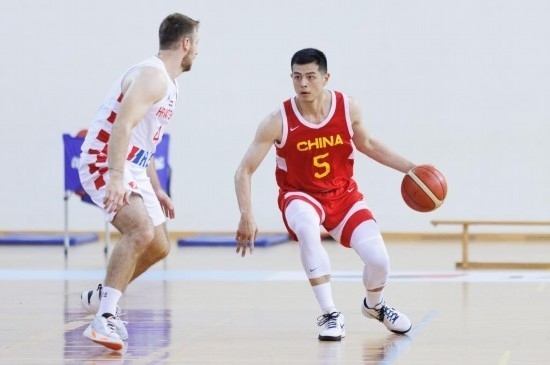 7月15日,在克羅地亞奧帕蒂亞舉行的一場(chǎng)男子籃球友誼賽,中國(guó)隊(duì)球員方碩(右)在比賽中運(yùn)球。新華社發(fā)(內(nèi)爾·帕夫萊蒂奇攝)