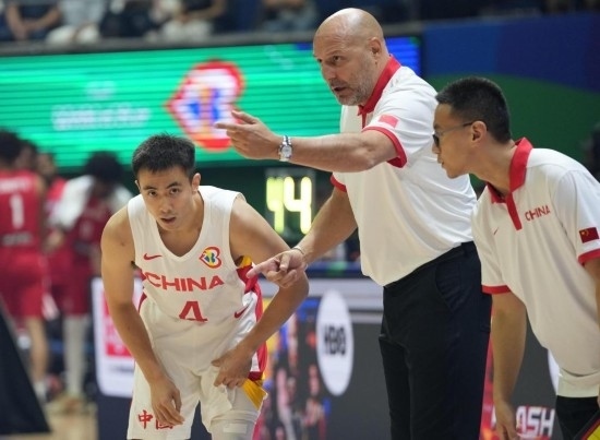 8月30日,中國(guó)隊(duì)主教練喬爾杰維奇(中)2023年籃球世界杯B組小組賽中指導(dǎo)球員趙繼偉(左)。新華社記者 孟永民 攝