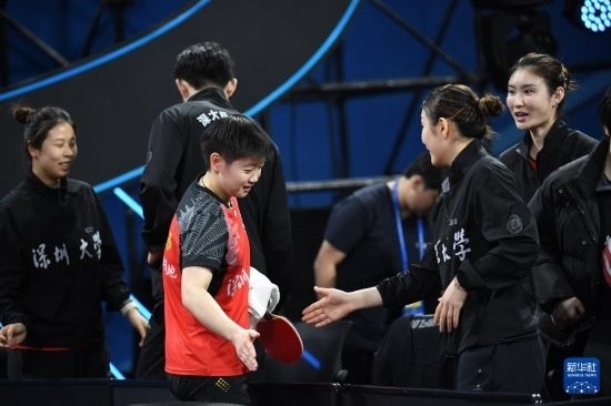 12月22日,深圳大學(xué)隊(duì)選手孫穎莎(左三)在女團(tuán)半決賽獲勝后與隊(duì)友陳夢(mèng)(右二)擊掌。她以3比0戰(zhàn)勝華東理工大學(xué)隊(duì)選手趙尚。最終深圳大學(xué)隊(duì)以總比分3比1戰(zhàn)勝華東理工大學(xué)隊(duì)。新華社記者 梁旭 攝