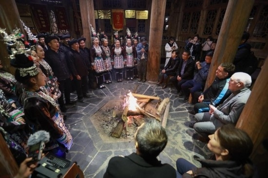 12月11日,榕江縣少數(shù)民族同胞用歌舞歡迎“學(xué)轉(zhuǎn)英超”培訓(xùn)團隊。新華社記者 劉續(xù) 攝
