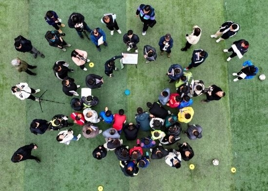 12月12日,學(xué)員參加“學(xué)轉(zhuǎn)英超”基層足球教練培訓(xùn)項目(無人機照片)。新華社記者 劉續(xù) 攝