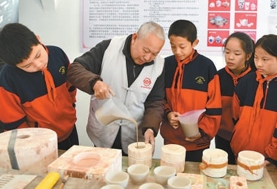 湖北通城的陶瓷非遺傳承人向?qū)W生們傳授陶藝制作技藝。劉建平攝(人民視覺(jué))