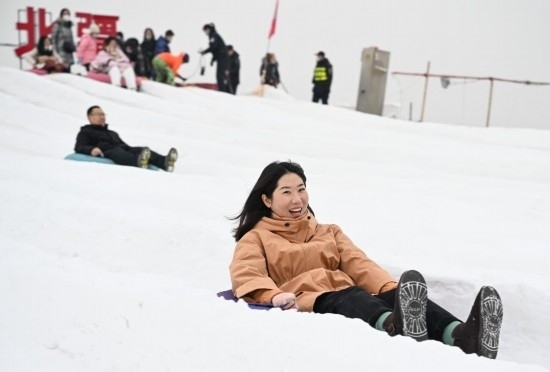 冬季的內(nèi)蒙古賽馬場(chǎng)變成了冰雪樂(lè)園,場(chǎng)地中間建起一座十幾米高的人造雪山,等著玩滑雪圈的人群從山頂一直排到山腳下,周圍還有冰上腳踏車、冰上陀螺等冰雪體驗(yàn)設(shè)備。曹博雅坐著雪圈從山頂飛速滑下,又拉著爸爸坐上了旋轉(zhuǎn)小雪車。