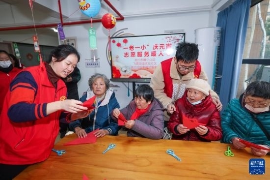 臨近元宵佳節(jié),浙江省湖州市吳興區(qū)飛英街道組織各社區(qū)社工和黨員志愿者開展形式多樣的“一老一小”慶元宵活動,組織老人和未成年人猜燈謎、剪窗花、做燈籠,還為行動不便的老人送去湯圓和節(jié)日的問候。