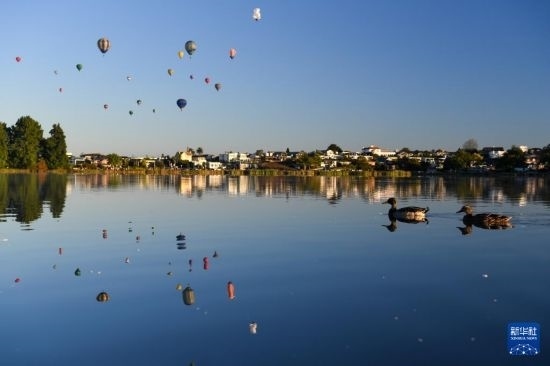 3月20日清晨,放飛的熱氣球經(jīng)過新西蘭漢密爾頓湖上空。