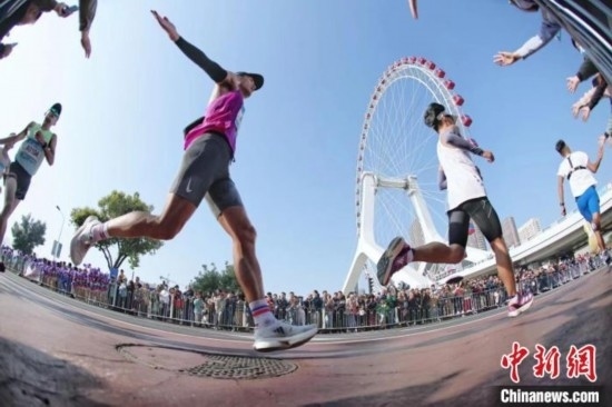 2023年10月,天津馬拉松時隔17年后重返市區(qū)進(jìn)行比賽,共吸引了29個國家和地區(qū)約9.5萬人參與報名。途經(jīng)7個行政區(qū)的線路串聯(lián)起天津五大道、民園廣場、世紀(jì)鐘、天津之眼等諸多天津城市地標(biāo)型建筑和知名景點,“驚艷”著來自世界各地的參賽選手。