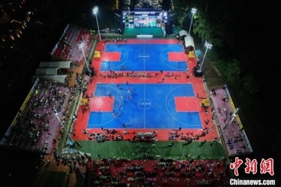 2023年8月2日晚,全國和美鄉(xiāng)村籃球大賽(村BA)東北賽區(qū)揭幕戰(zhàn)在天津市薊州區(qū)郭家溝村開賽。(無人機照片) 佟郁 攝