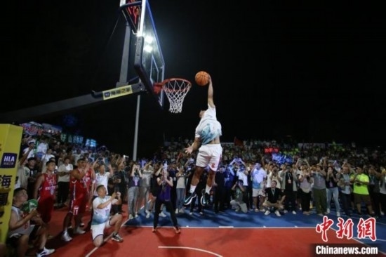 2023年8月2日晚,全國和美鄉(xiāng)村籃球大賽(村BA)東北賽區(qū)揭幕戰(zhàn)在天津市薊州區(qū)郭家溝村開賽。圖為比賽現(xiàn)場。佟郁 攝