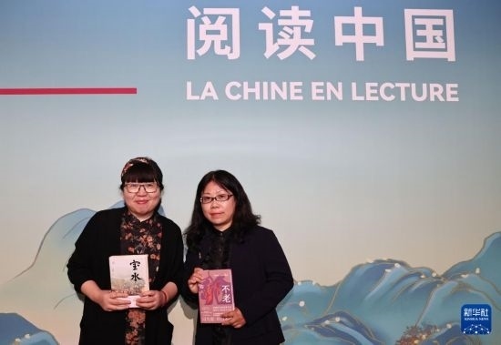 4月14日,在法國(guó)巴黎舉行的2024巴黎書(shū)展上,中國(guó)作家喬葉(左)、葉彌分別攜其作品《寶水》《不老》亮相書(shū)展。