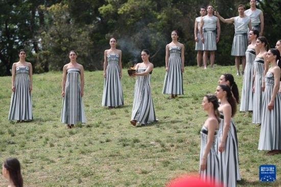 當?shù)貢r間12時16分,在有2500多年歷史的赫拉神廟遺址前,由希臘女演員瑪麗·米娜扮演的古希臘女祭司向光明之神阿波羅祈禱后點燃了火種。由于現(xiàn)場多云,火種點燃環(huán)節(jié)沒有采用傳統(tǒng)的凹面鏡取火,而是選用了此前備用的火種。