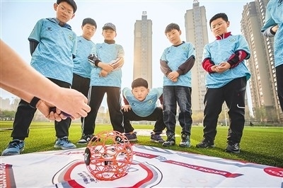 河北省唐山市豐南區(qū)胥各莊小學(xué)學(xué)生正在學(xué)習(xí)無人機足球操作要領(lǐng)。李福政攝(人民視覺)