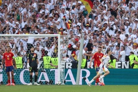 久攻之下,德國隊終于在第89分鐘扳平比分,米特爾施泰特左路傳中,基米希頭球回擺,維爾茨抽射入網(wǎng)。兩隊在常規(guī)時間1:1戰(zhàn)平,比賽進入加時賽。第106分鐘,德國隊穆夏拉射門擊中西班牙隊庫庫雷利亞手臂,后者當時在本方禁區(qū)內(nèi)防守,但主裁判并沒有判罰點球,VAR(視頻助理裁判)也沒有介入。