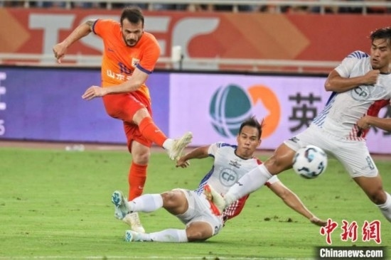 山東泰山隊(duì)卡扎伊什維利(左一)在比賽中射門(mén)。中新社發(fā) 陳陽(yáng) 攝