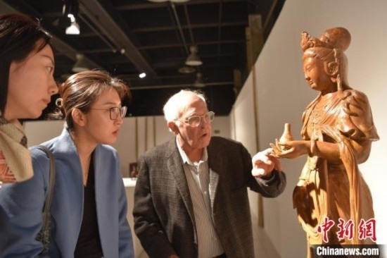 當(dāng)?shù)貢r(shí)間8月12日,巴西圣保羅州坎皮納斯市,“中國(guó)藝術(shù)五千年 塞奎拉·萊特收藏”啟幕。圖為巴西文物修復(fù)師毛羅·里貝羅(右一)講解如何修復(fù)木雕觀音像。中新社記者 林春茵 攝