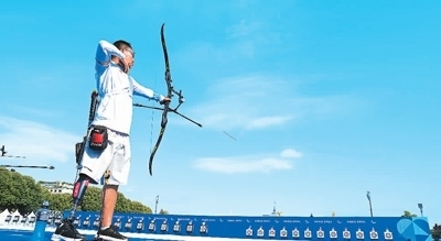 當(dāng)?shù)貢r(shí)間8月24日,在法國巴黎榮軍院旁的射箭訓(xùn)練場內(nèi),中國殘奧射箭隊(duì)在進(jìn)行適應(yīng)性訓(xùn)練。拉弓、瞄準(zhǔn)、松弦,中國隊(duì)選手甘俊射出正中靶心的一箭后,臉上露出笑容。他表示:“風(fēng)速、風(fēng)向?qū)穆潼c(diǎn)影響較大,我會(huì)盡快適應(yīng),調(diào)整到最佳狀態(tài)?!备士?duì)自己參加的首屆殘奧會(huì)充滿期待。