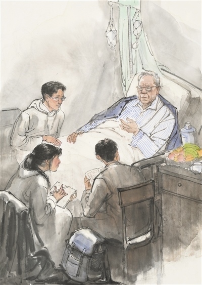 人民教師勤學(xué)篤行、求是創(chuàng)新的躬耕態(tài)度,給無(wú)數(shù)人以榜樣的力量,也給美術(shù)創(chuàng)作以靈感?!叭嗣窠逃摇眹?guó)家榮譽(yù)稱(chēng)號(hào)獲得者衛(wèi)興華,終其一生都奮斗在勤學(xué)求真的道路上。90余歲時(shí),即使病痛纏身,他仍堅(jiān)持每天學(xué)習(xí)、工作。有感于衛(wèi)興華教授的敬業(yè)精神,高毅特意描繪了臥病在床的衛(wèi)興華堅(jiān)持與學(xué)生探討學(xué)術(shù)課題的場(chǎng)景,主人公那專(zhuān)注的神情令人動(dòng)容。像衛(wèi)興華這樣堅(jiān)守耕耘的教師還有許多。劉昌明水彩畫(huà)《一個(gè)教師的工作臺(tái)》便以細(xì)致的場(chǎng)景描繪表達(dá)出對(duì)教師群體的敬意。貼著泛黃舊紙的墻面、藥瓶和墨水瓶之間的教案、脫漆的木桌、一副老花眼鏡……畫(huà)家在此調(diào)動(dòng)了一切能夠反映老一輩教育者辛勤伏案的元素,象征著沒(méi)有直接出場(chǎng)的教師形象。“此處無(wú)聲勝有聲”的表達(dá)效果,令人回味無(wú)窮。