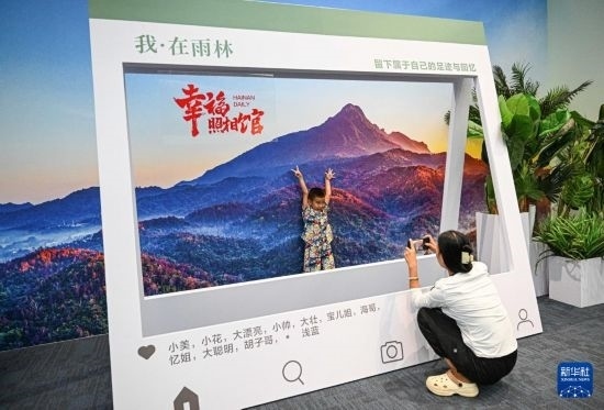 10月13日,在“守護(hù)雨林家園——海南熱帶雨林國家公園建設(shè)主題展”現(xiàn)場(chǎng),觀眾與海南熱帶雨林背景墻留影。